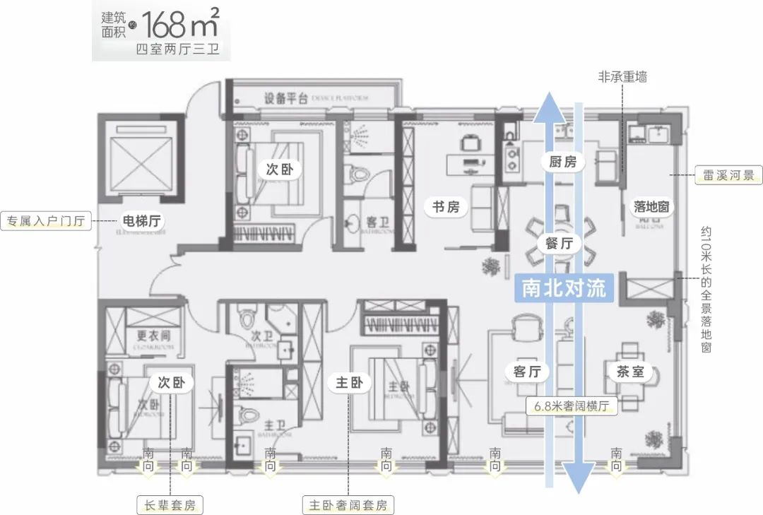 在紫金大院,建筑不再只是容器,而是与自然共生的艺术。建面168㎡户型以360°巨幕视野打破空间界限,东向揽河入室,让每一扇窗都成为流动的风景画。