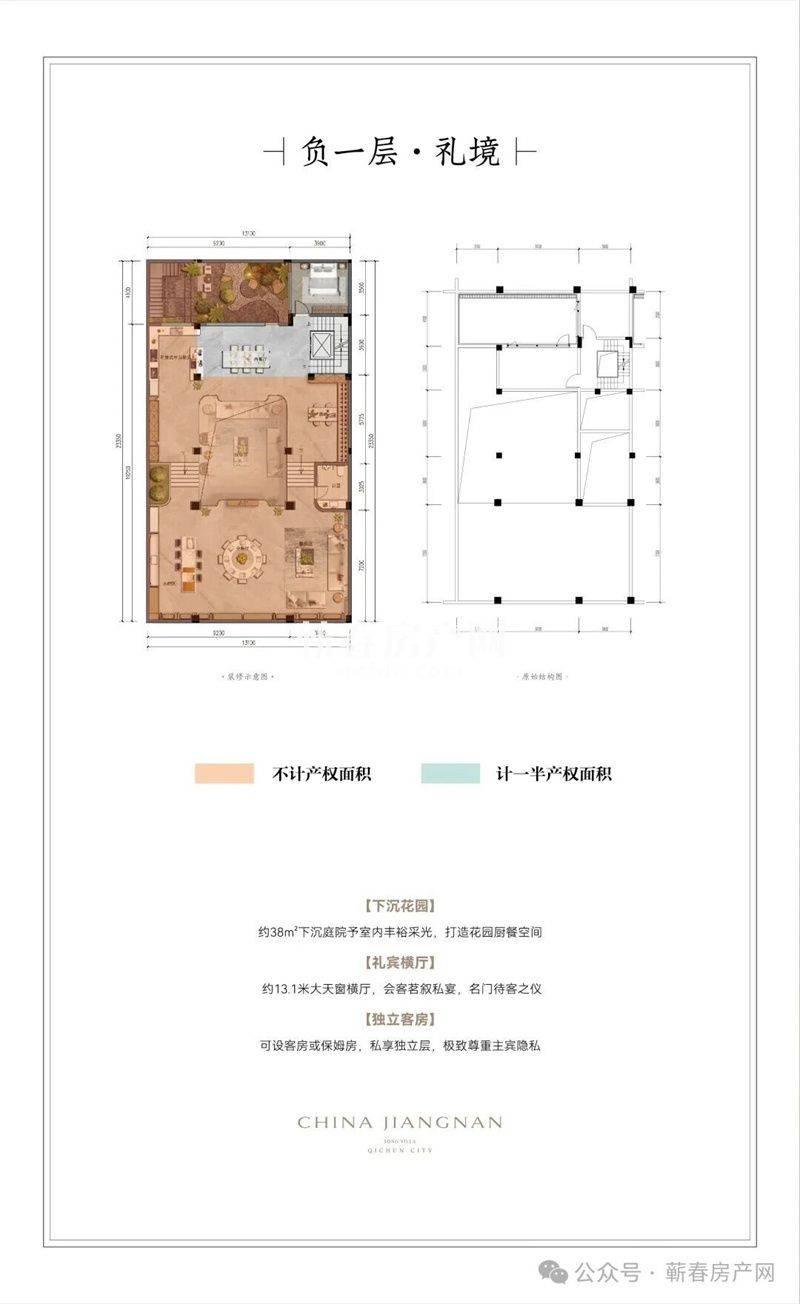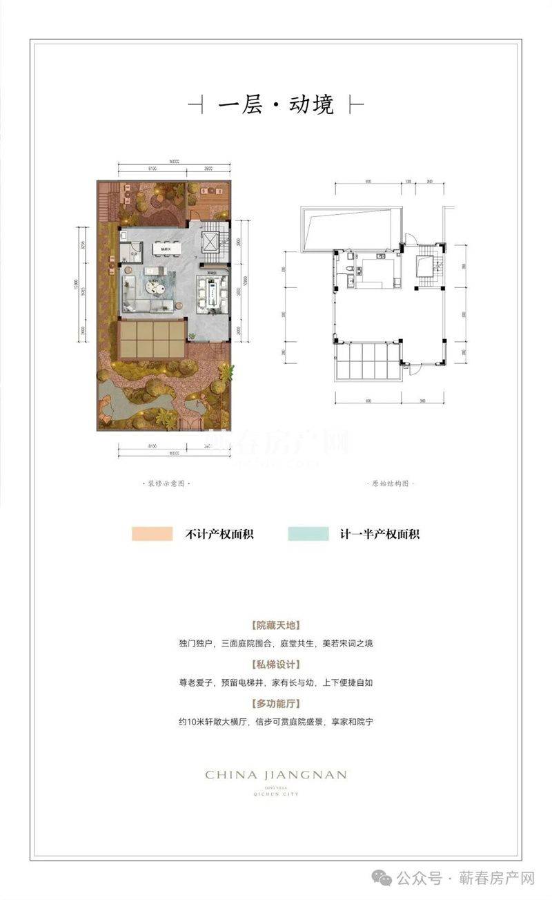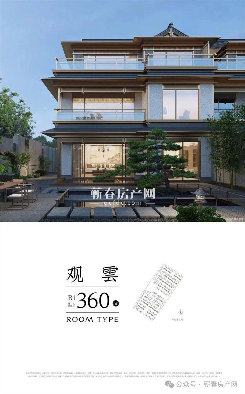 建筑之内,建面约280-500㎡宽境合院,以约7米挑高地下室营造会所级社交聚场,庭院阔厅相拥,雍容大宅气象自成。建面约480㎡景曜楼王,实享约1000㎡空间,地上两层类独栋制式,配合原创金钥匙户型与六重环簇庭台,打造蕲春仅有的全景厅室生活。建面约360㎡观雲户型,三面庭院围合、约10米大面宽、整层主卧套房约22米环幕露台,让云影天光成为日常诗篇。